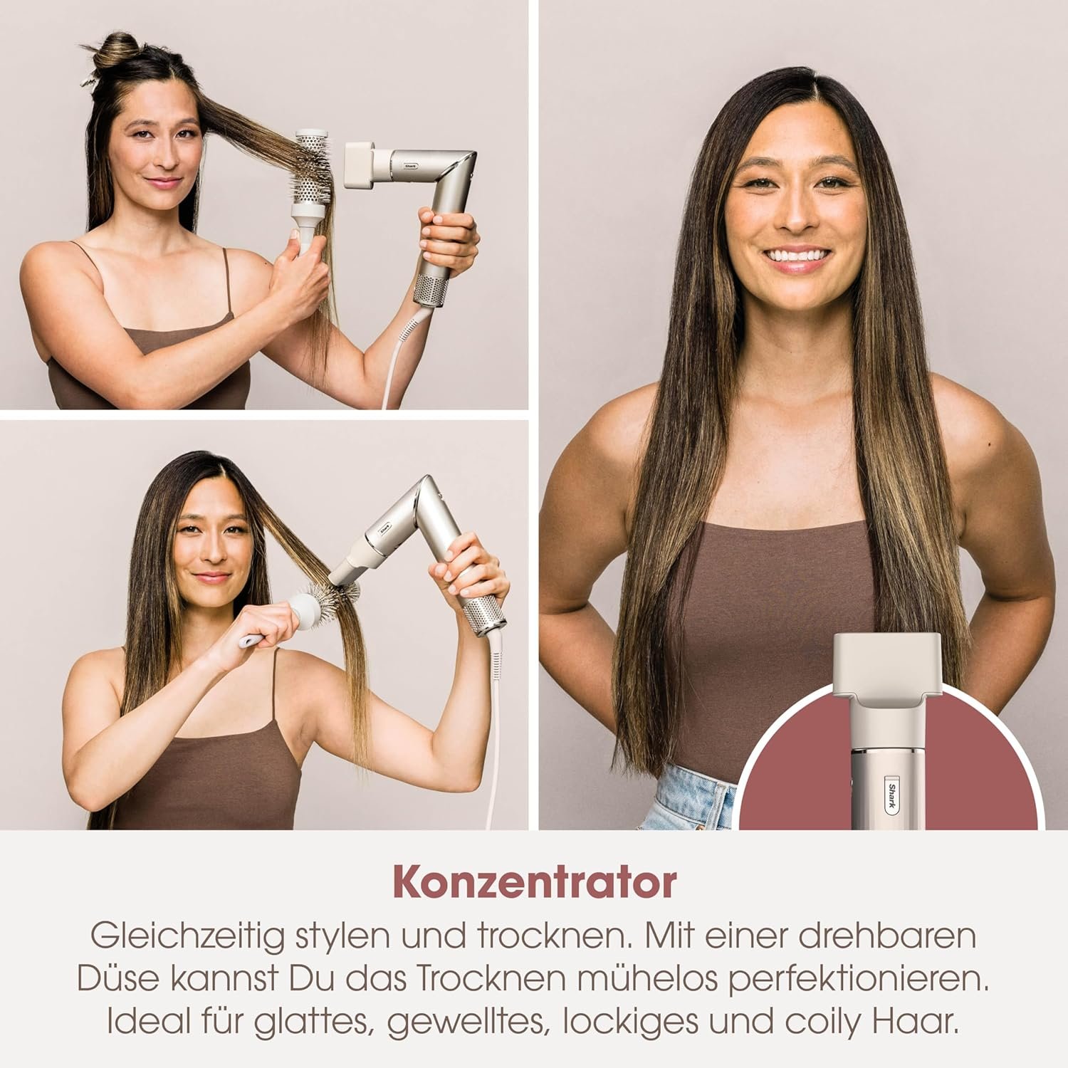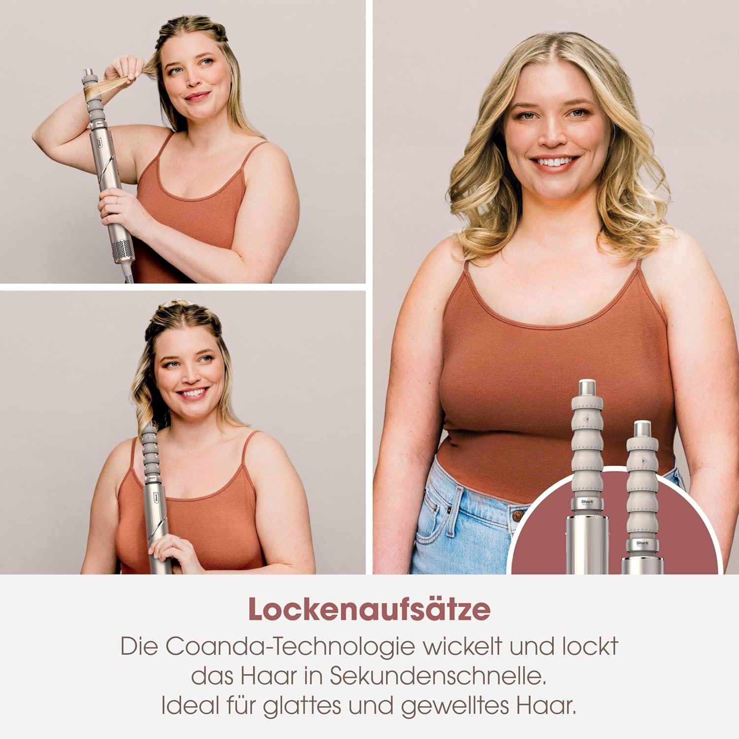 - BEINHALTET: Shark FlexStyle, 2x Auto-Wrap-Lockenwickler, Ovalbürste, Konzentratordüse, Styling-Anleitung. Gewicht: 700g. Farbe: Champagner